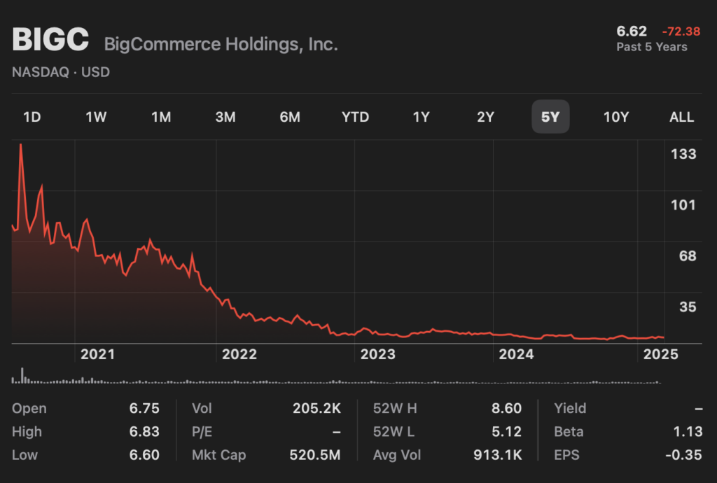 BigCommerce declined from a market high of $130 in August 2020 to the current price of ~$6.70 per share.