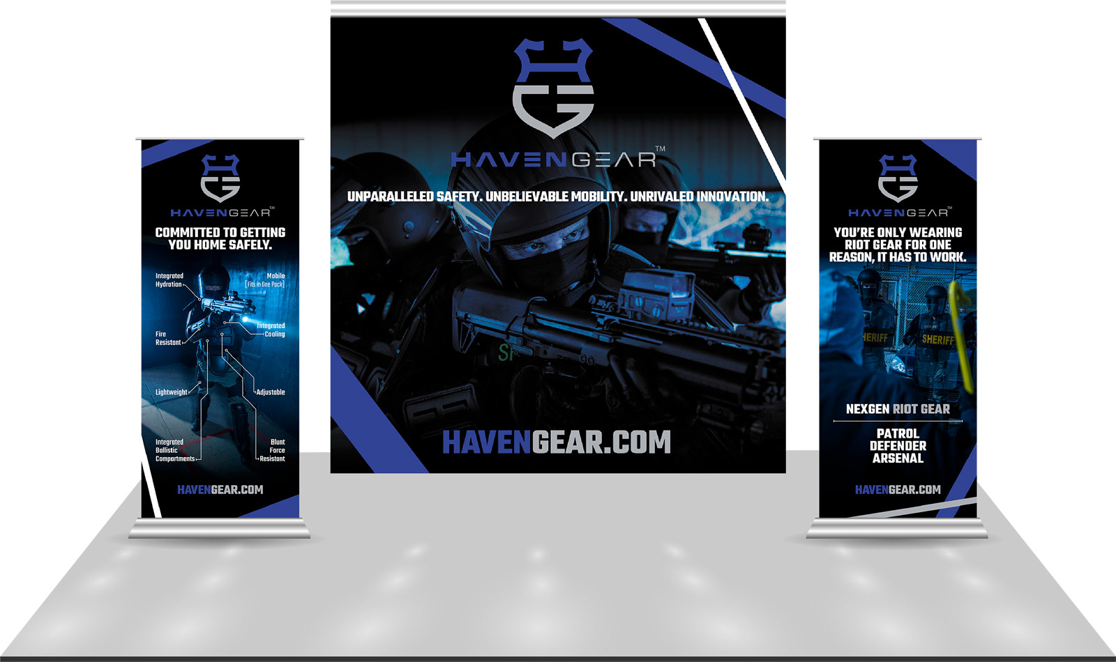 Creating trade show materials for a company like Haven Gear is exciting. Building the brand with stunning photography and bold colors lends itself to visually impactful signs that stand out and showcase their revolutionary riot suits.