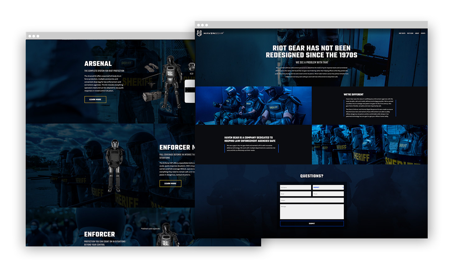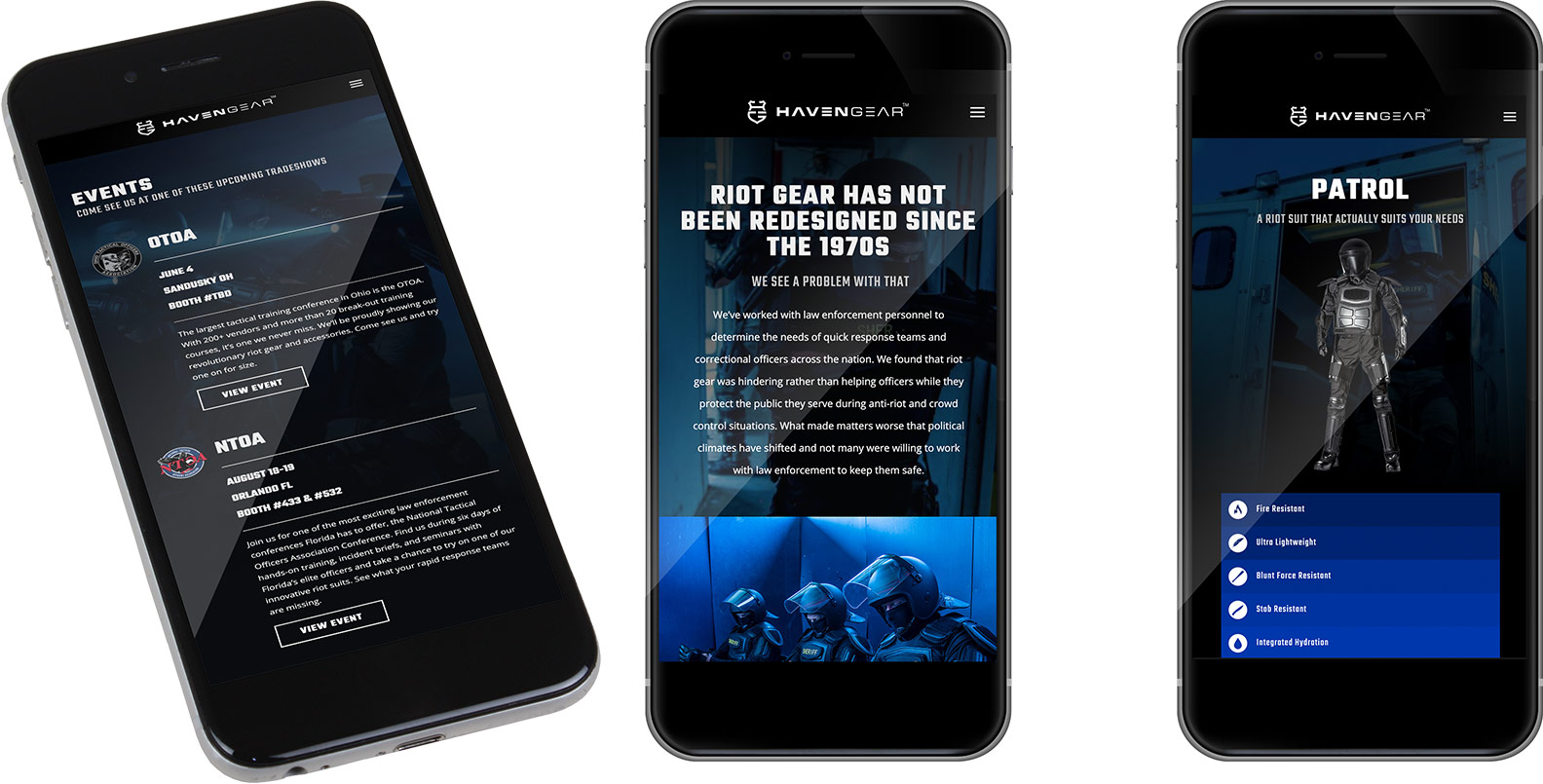 Haven Gear is a growing company who fights with giants in their industry every day. Their patented suits have revolutionized the game, but their old website didn’t show that. The non-responsive site was difficult to navigate on the trade show floor, and that was a major problem. We needed to create a website that was intuitive, user friendly and lightning fast so that Haven Gear can effectively outfit law enforcement agencies in next gen riot gear.